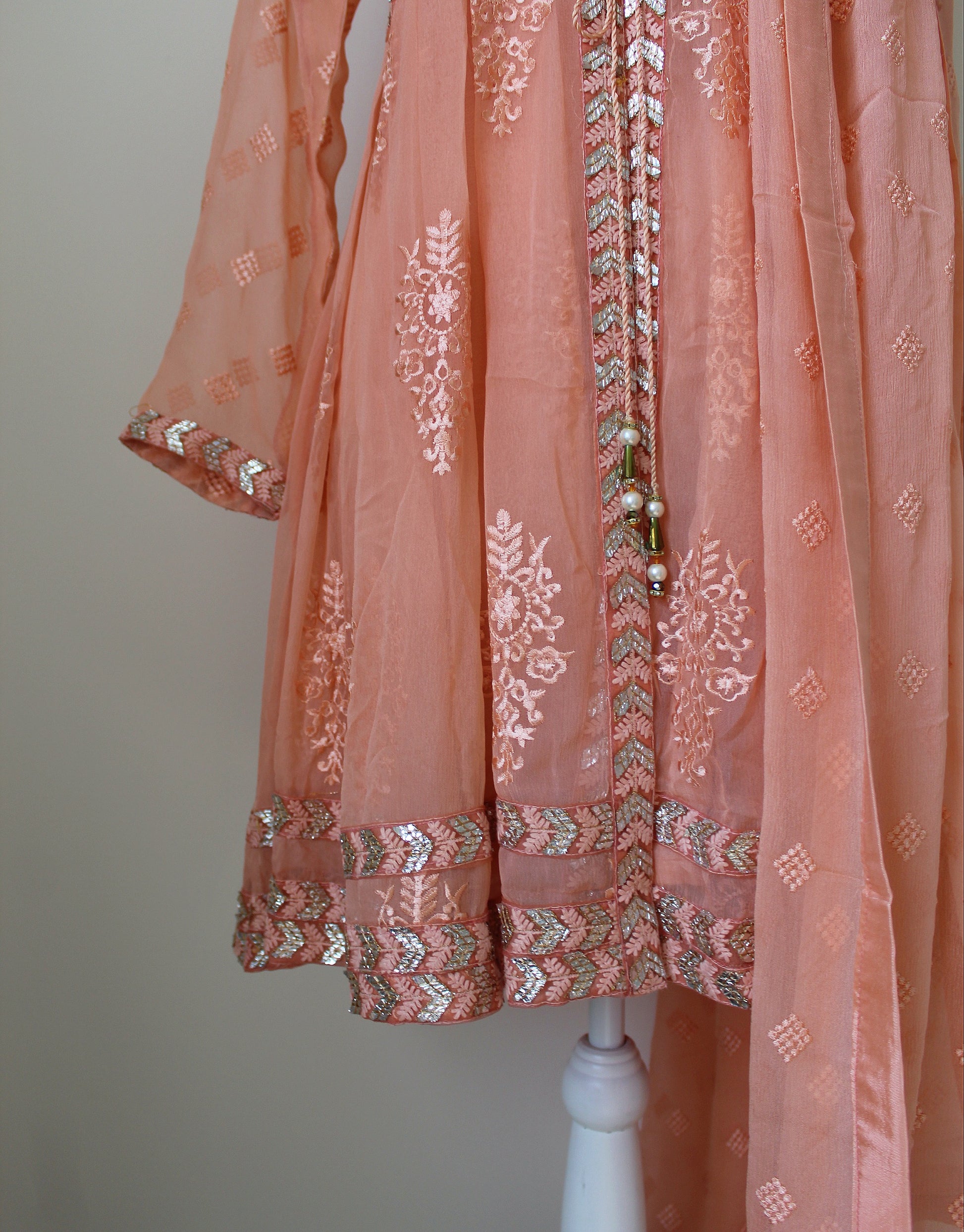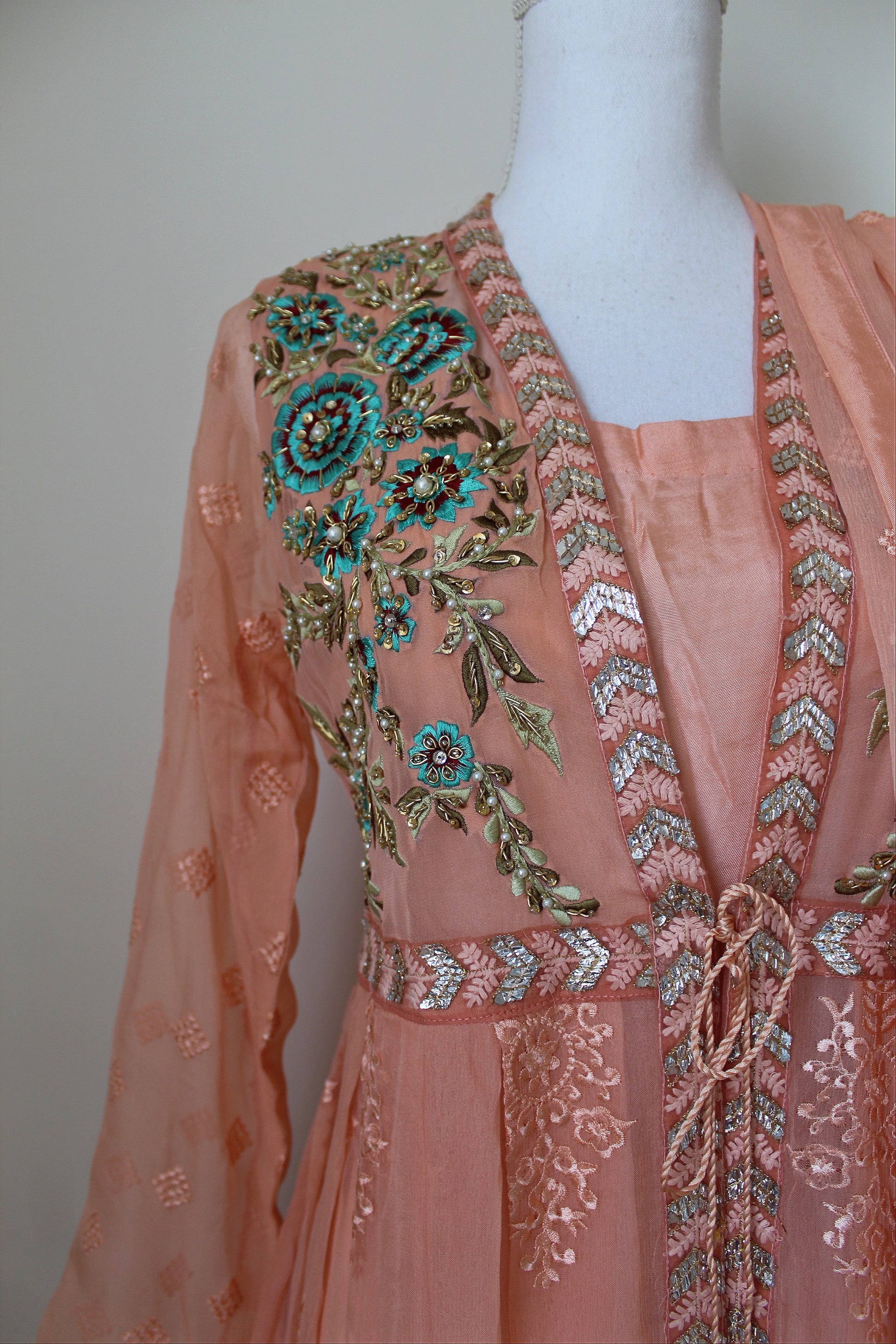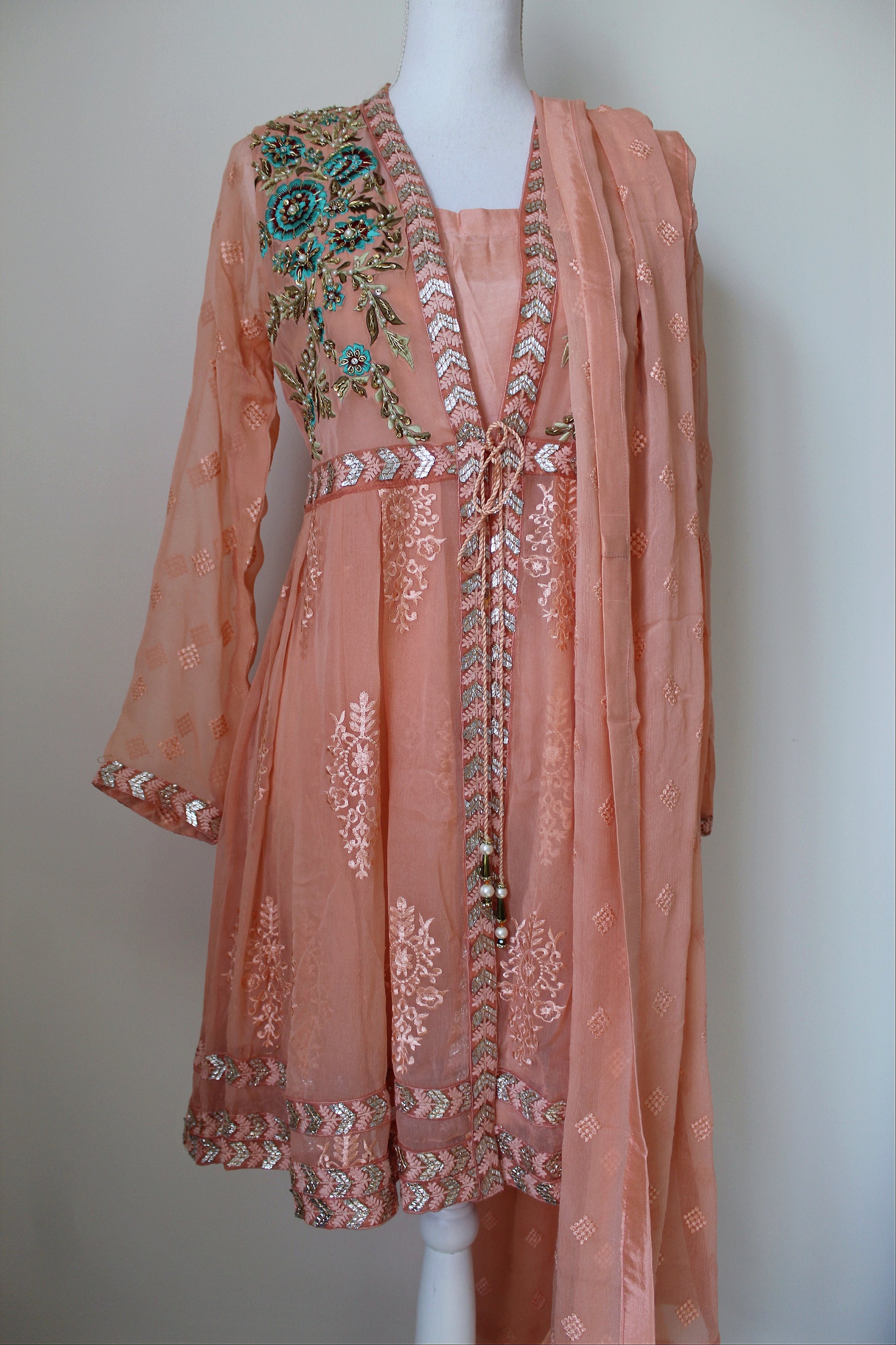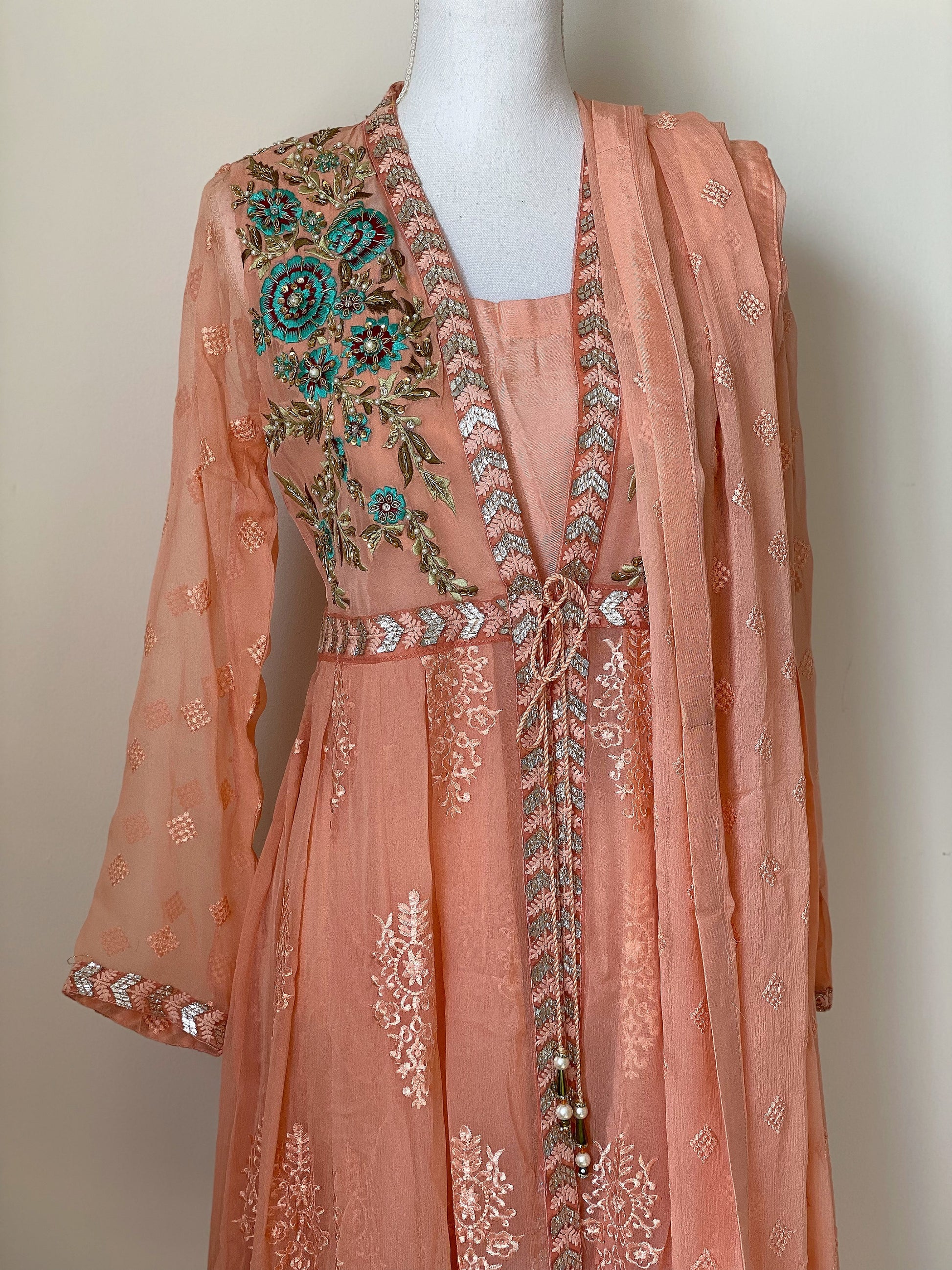 Open front coat with attached lining, Embroidered chiffon fabric with machine and hand work detailing. Paired with a crinkle chiffon embroidered dupatta and gharara pants.