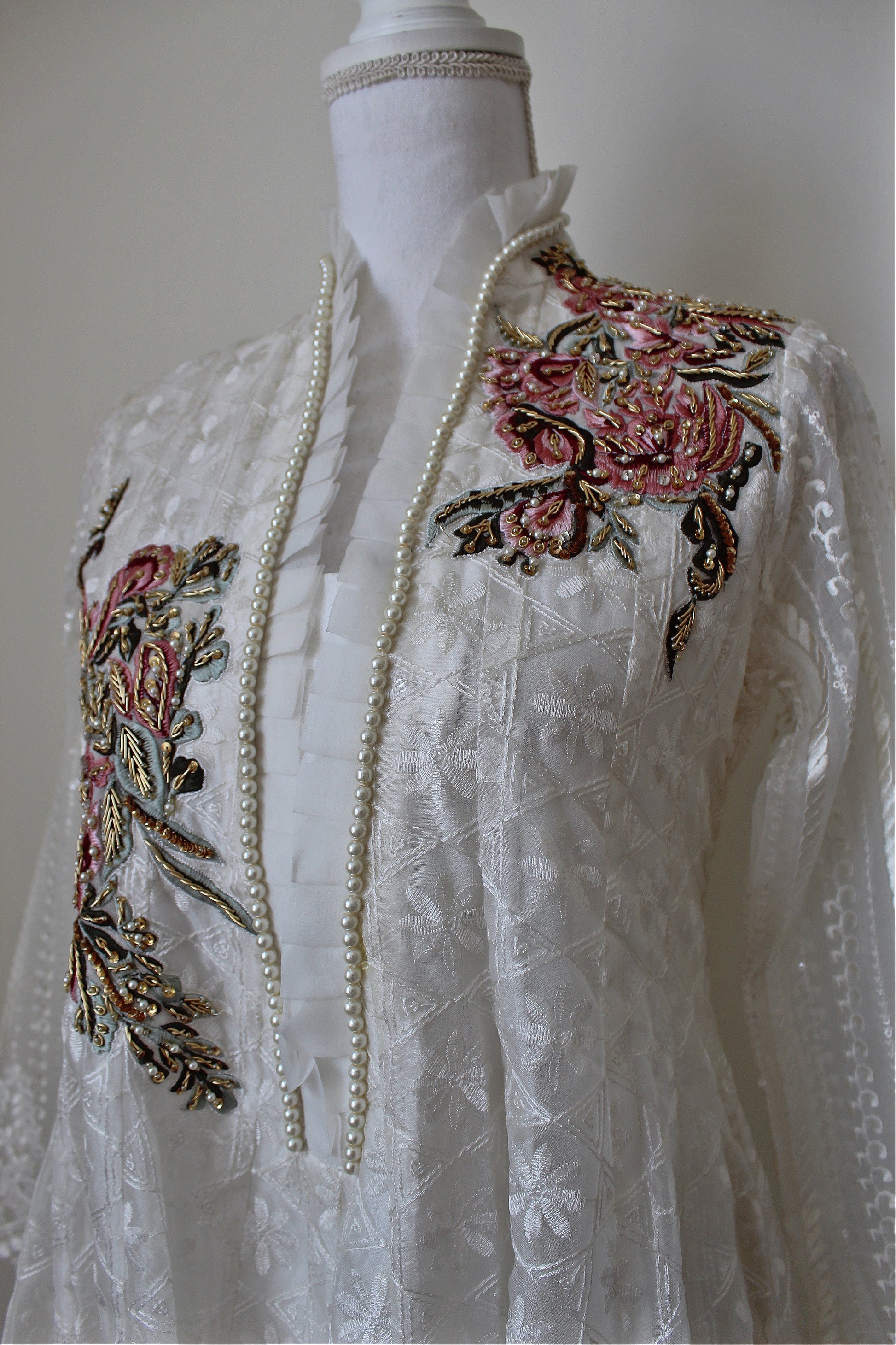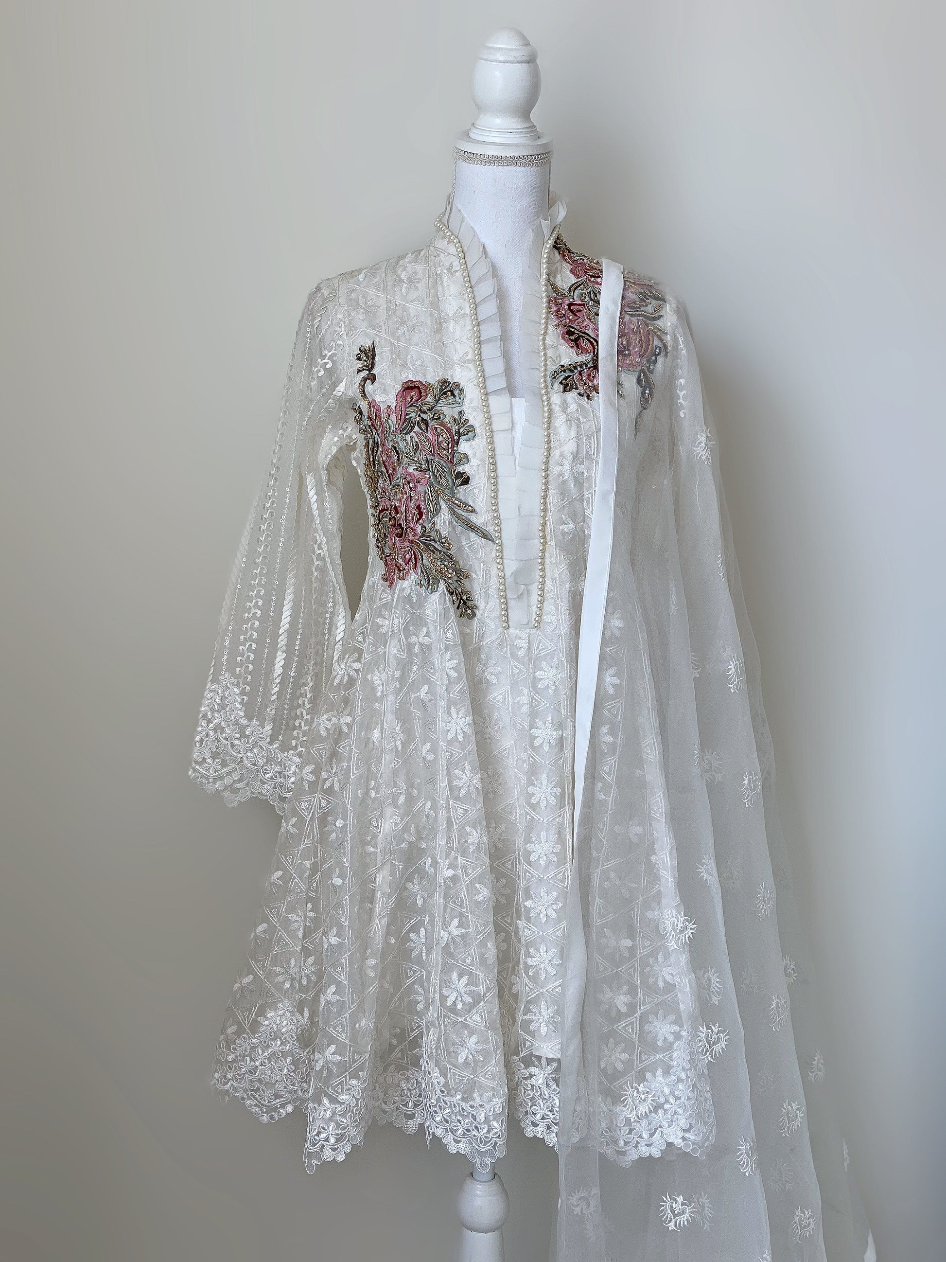 EMBROIDERED ORGANZA WITH MACHINE AND HANDWORK DETAILS. PAIRED WITH A EMBROIDERED SOFT ORGANZA DUPATTA AND PLAIN WHITE TROUSERS.