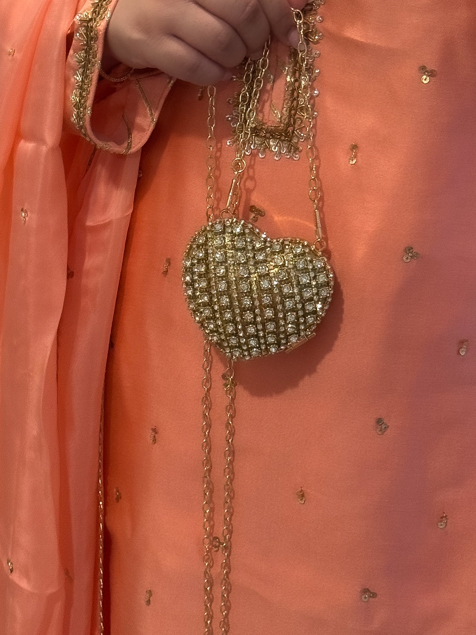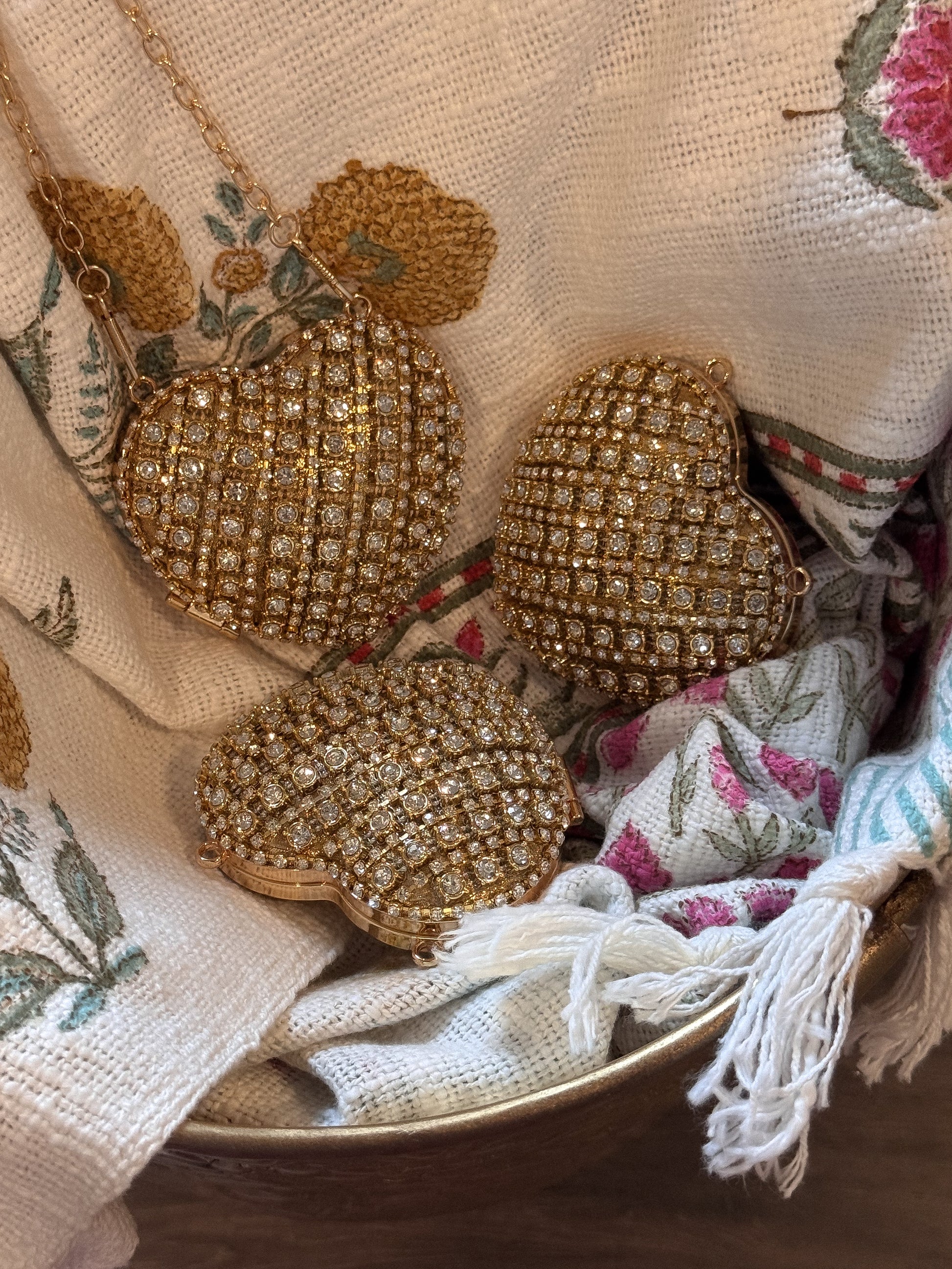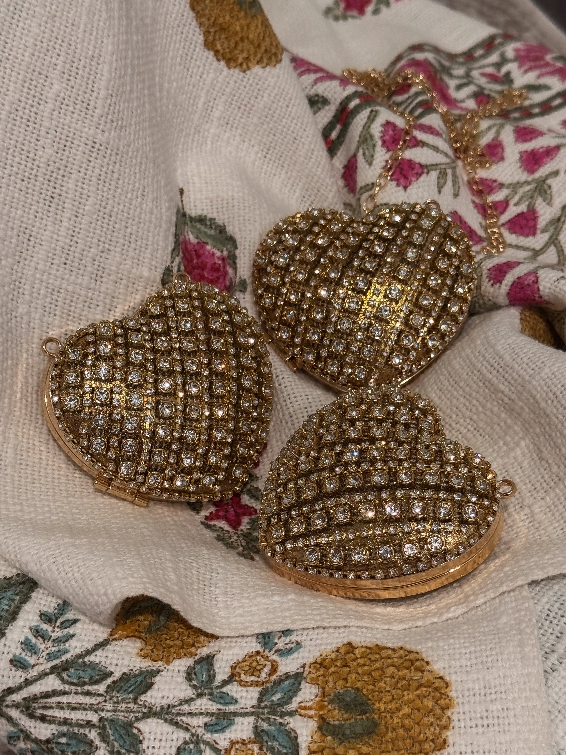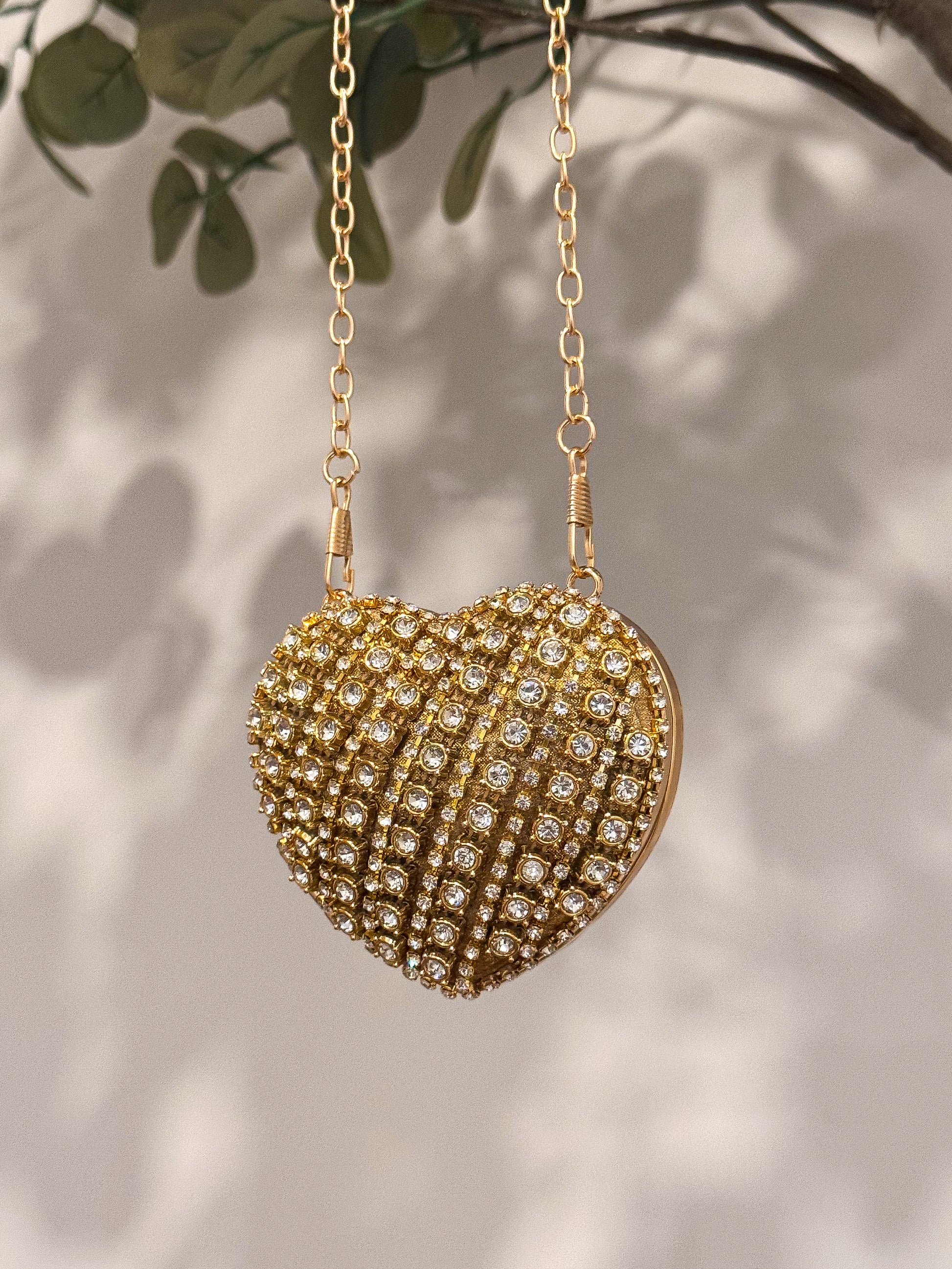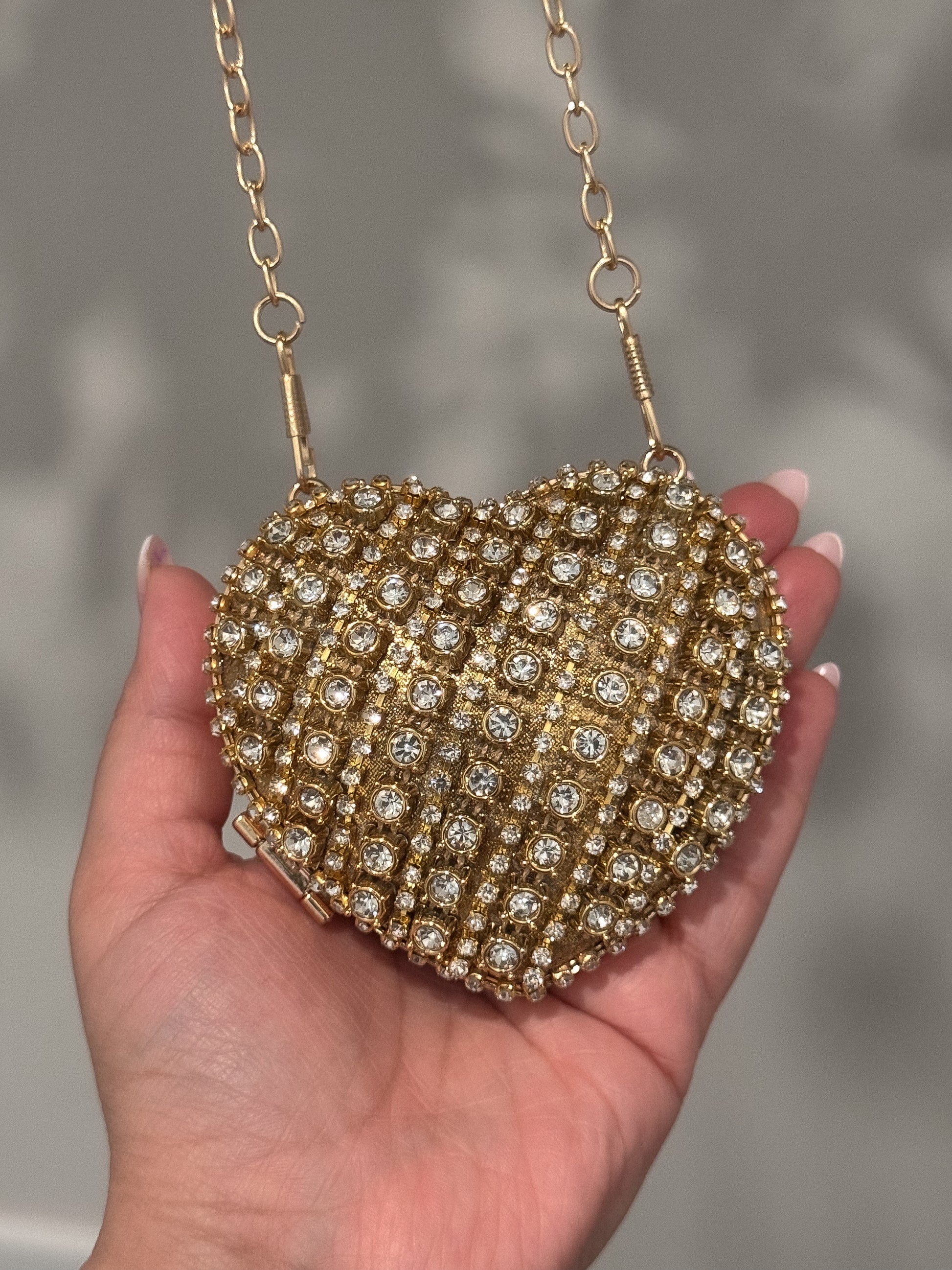 Our JAYA MINI BAG is a stylish heart-shaped bag with a long strap. Embellished with rhinestones, it is perfect for adding a touch of glamour and statement to any outfit.