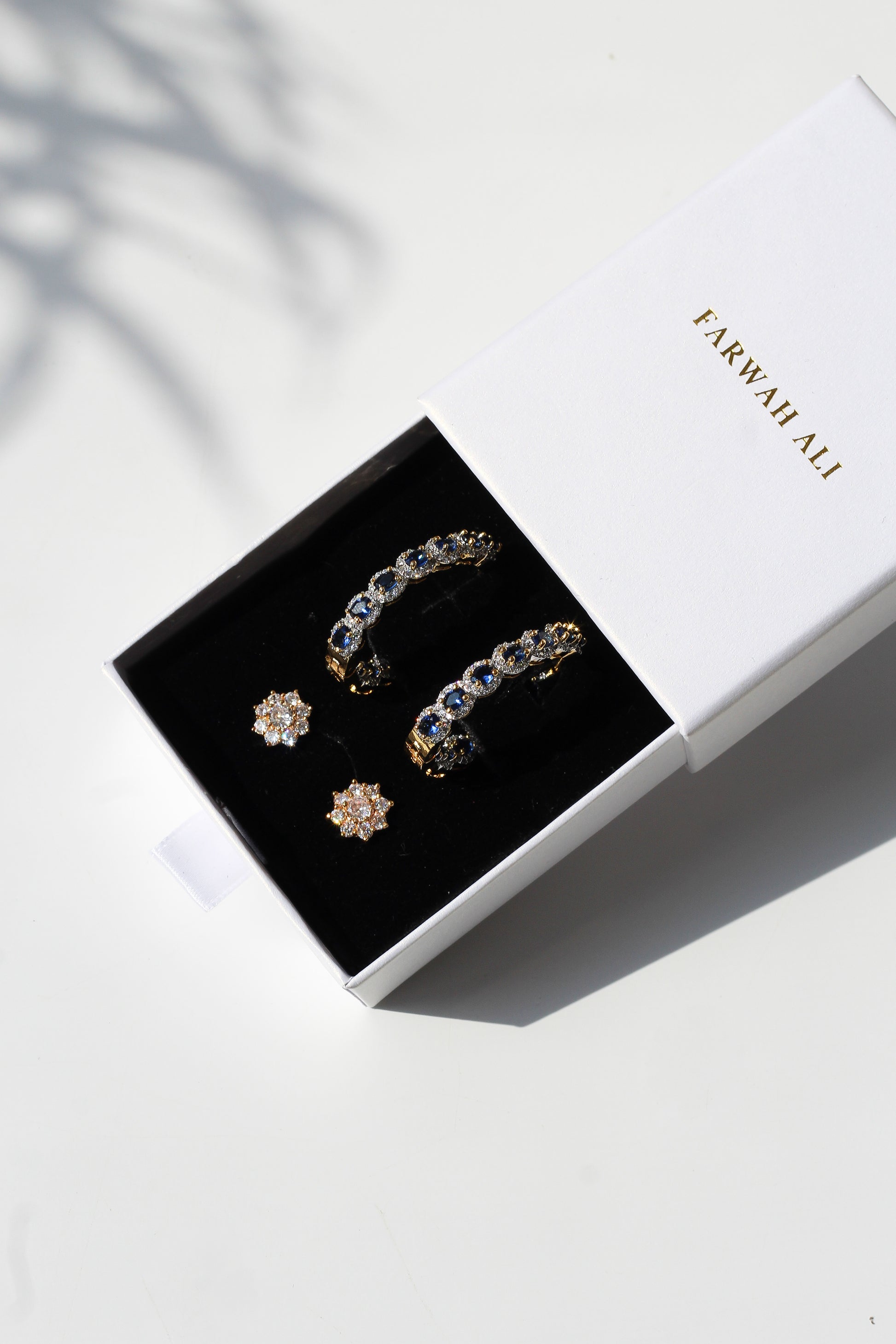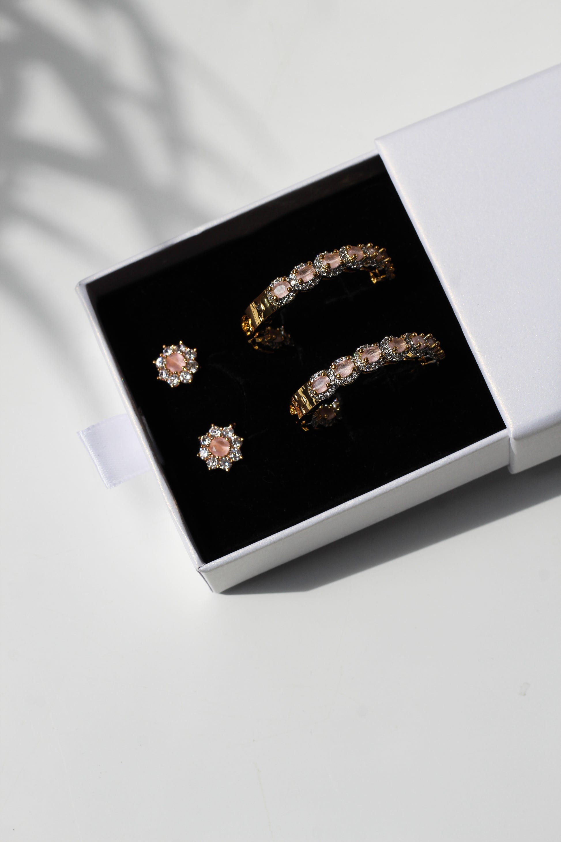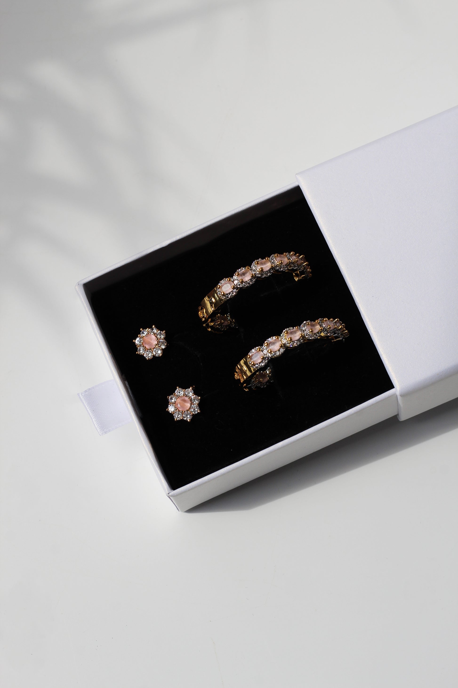 Our LUBNA earring set is the perfect accessory. These lightweight cubic zirconia detailed hoops, finished with gold plating, are sure to add a touch of glamour to any look. The set also includes stud earrings for added versatility.
