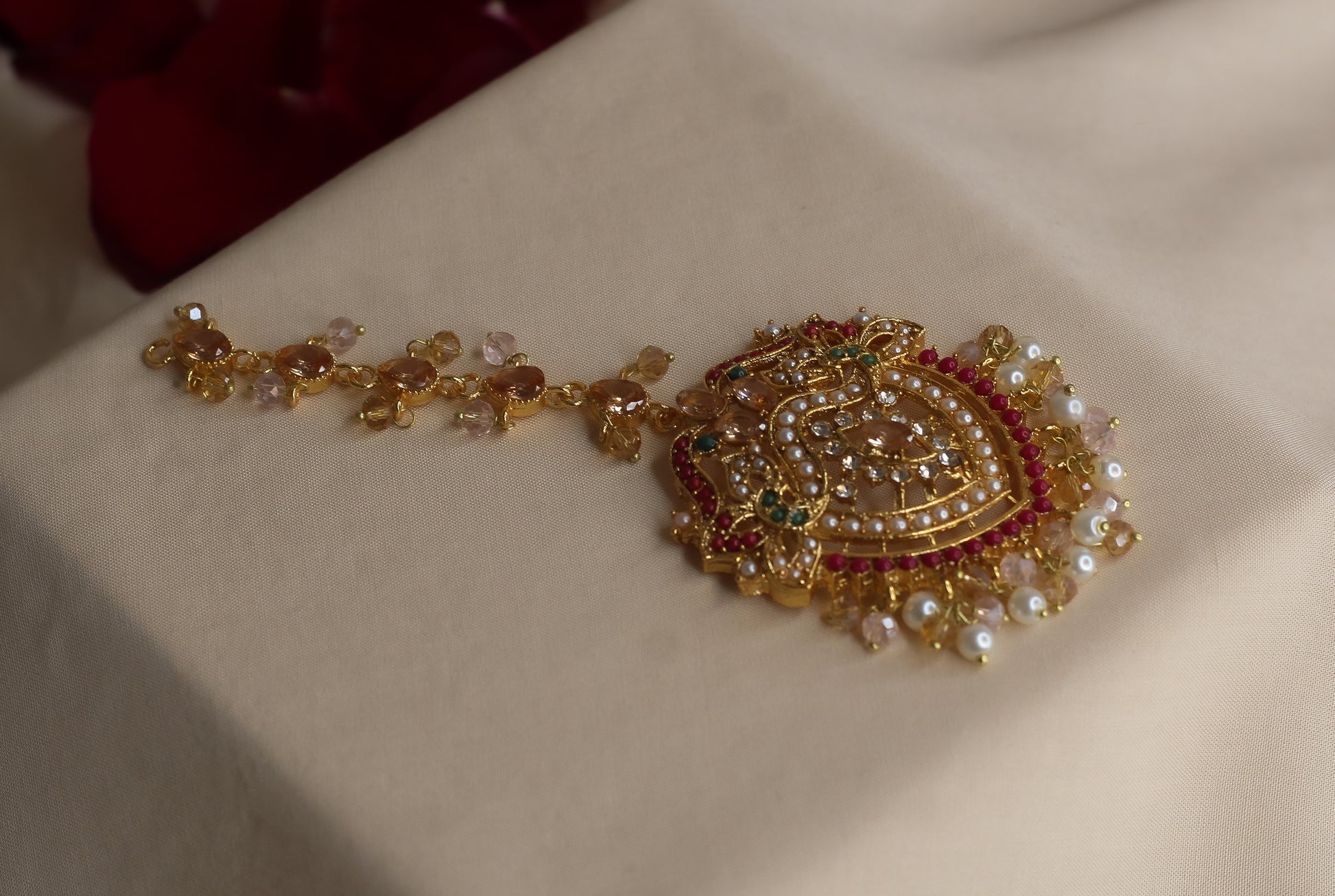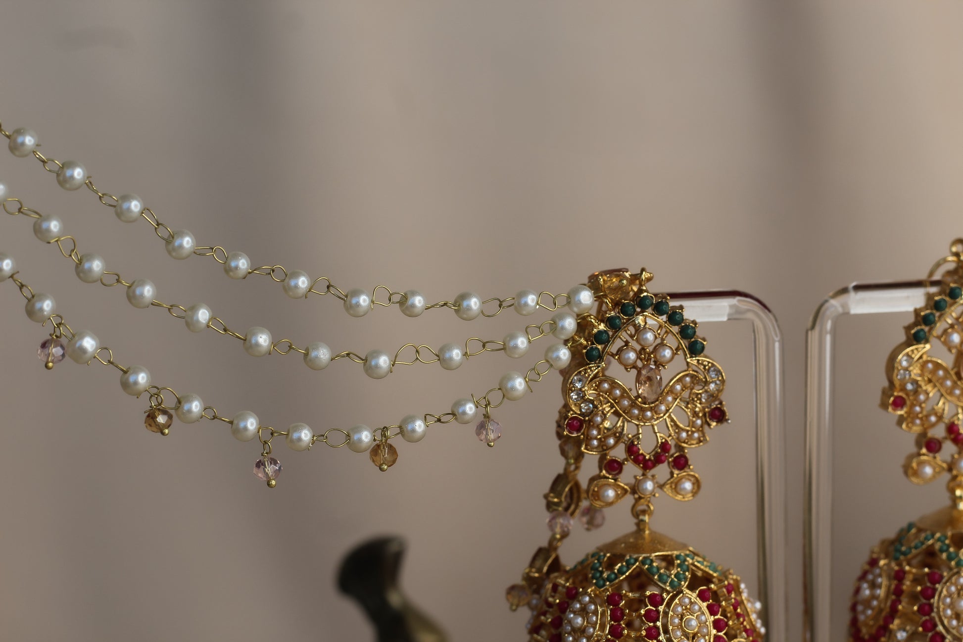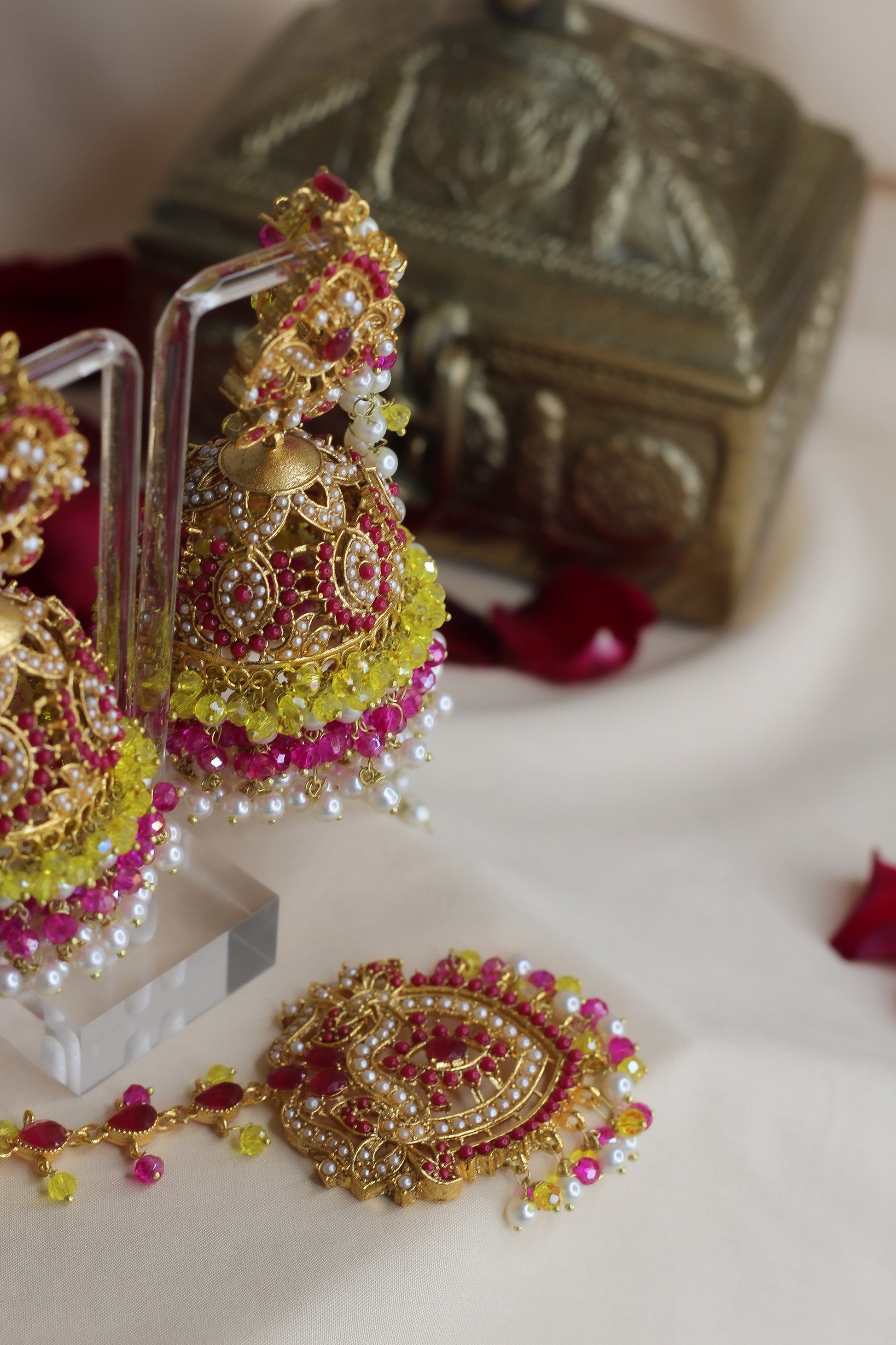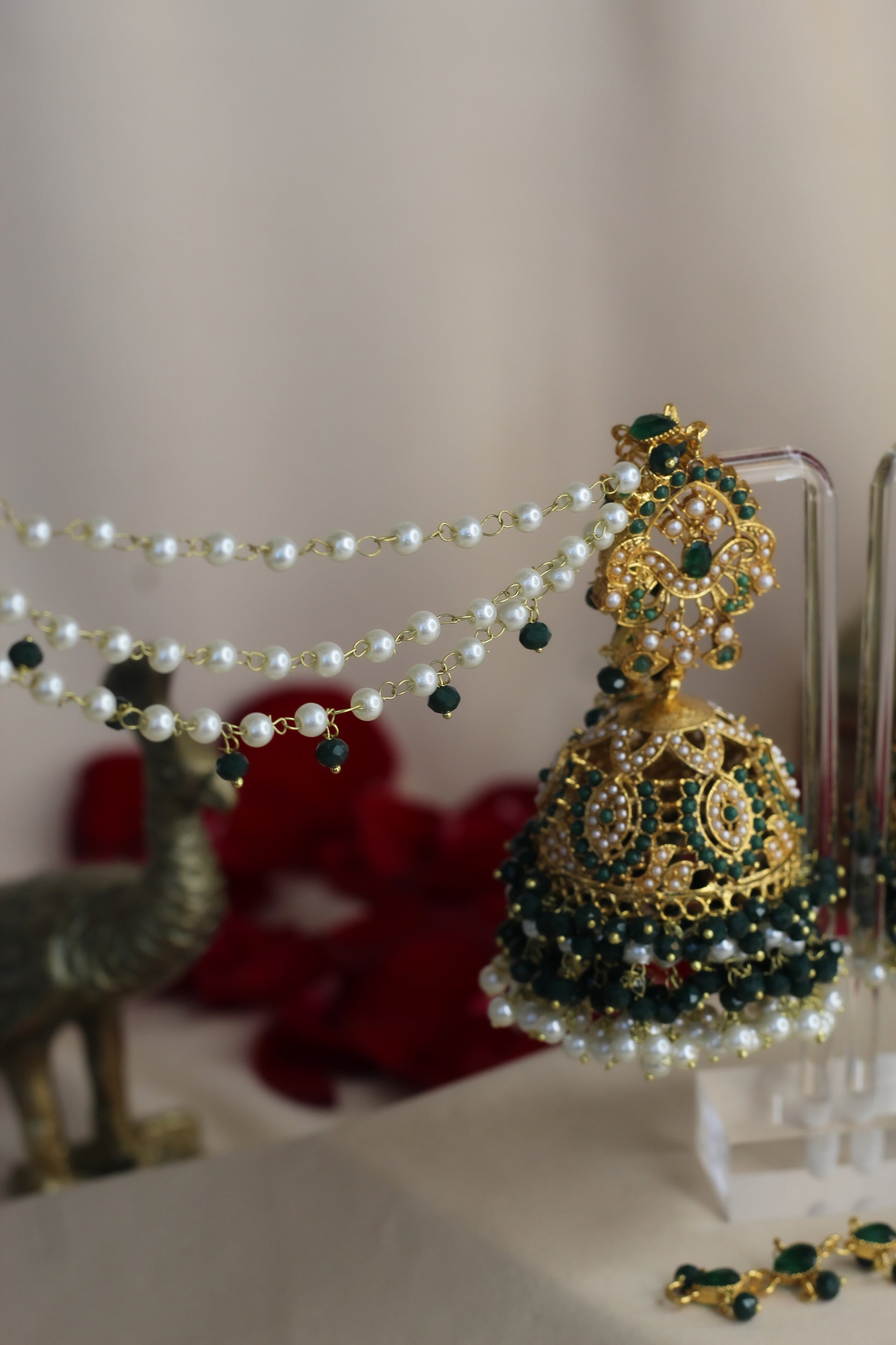 The MAHNOOR SET : This is the ultimate statement piece for any wedding or special occasion. With its oversized look and attached saharas, it adds a touch of grandeur to any outfit. Despite its heaviness, the saharas cleverly lighten the weight, ensuring comfort and style. Elevate your look with this luxurious set.
