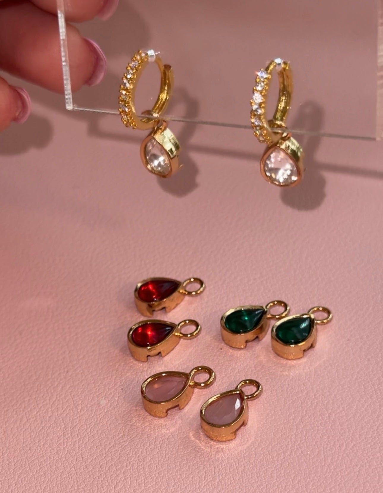 Elevate your everyday look with our RUMA earrings – dainty, versatile earrings  designed to match your mood and outfit. These elegant gold-tone hoops come with four interchangeable stone drops in shades of blush pink, emerald green, crystal clear, and deep wine. Whether you’re dressing up for a celebration or keeping it minimal, simply swap out the charm to customize your style in seconds.