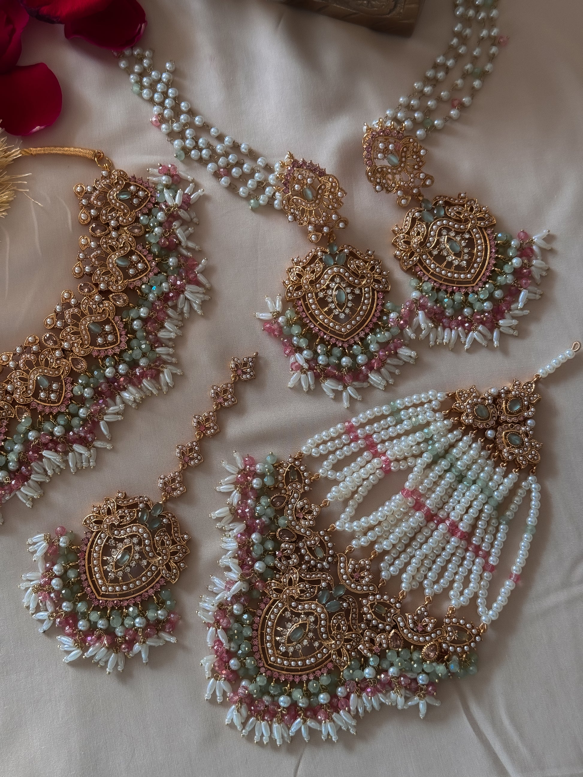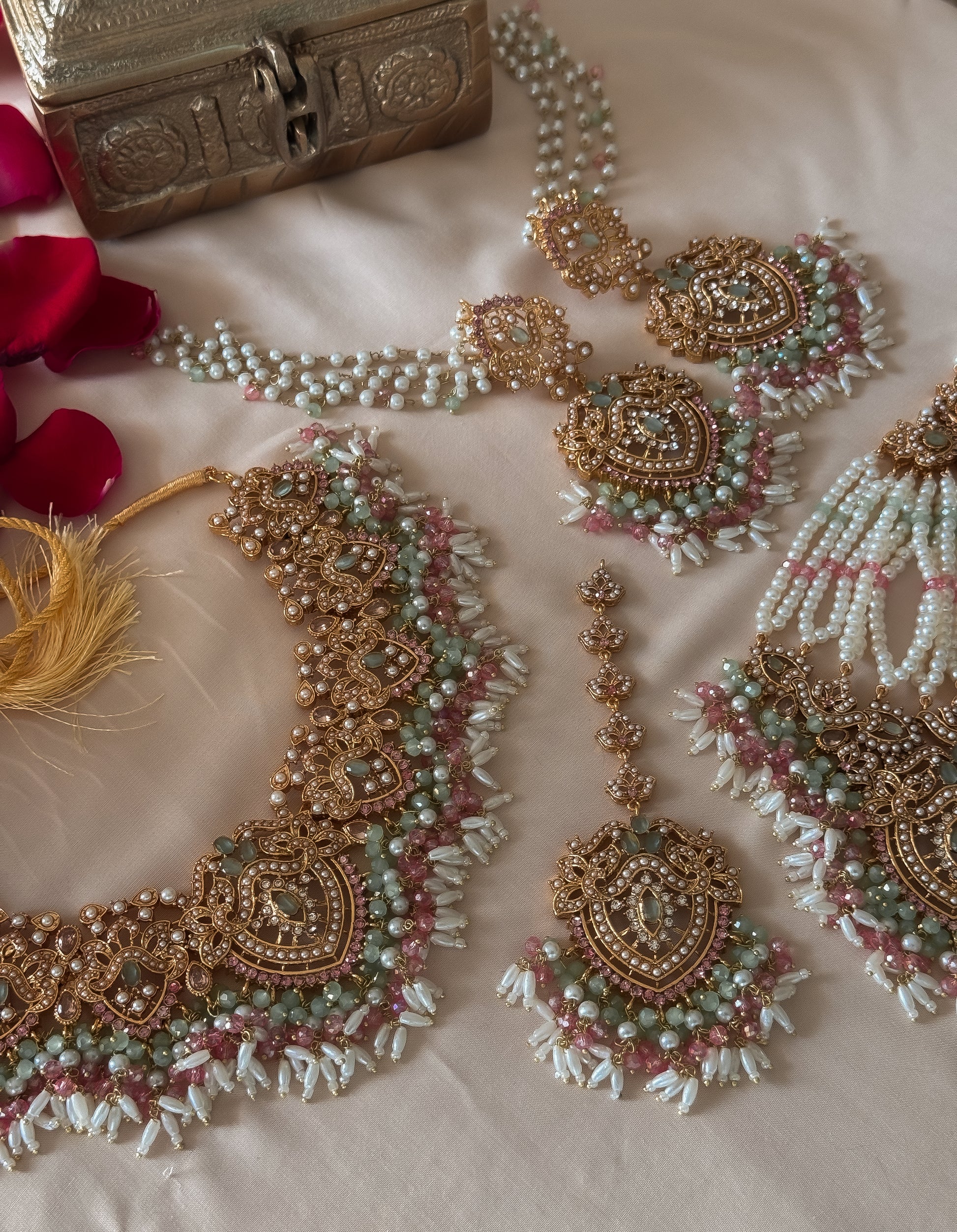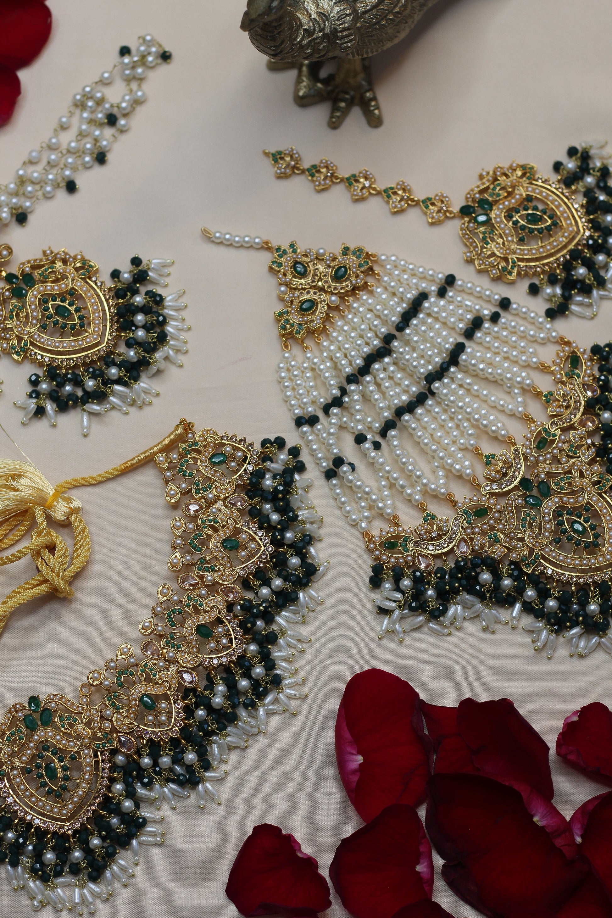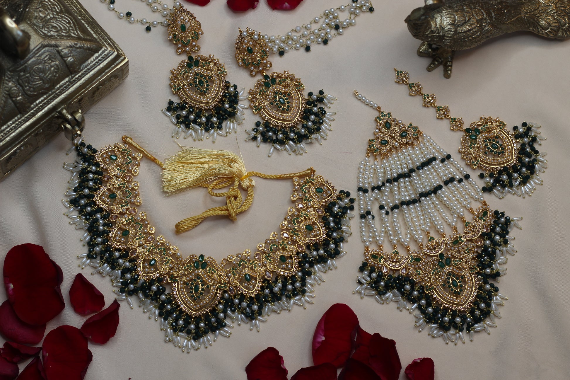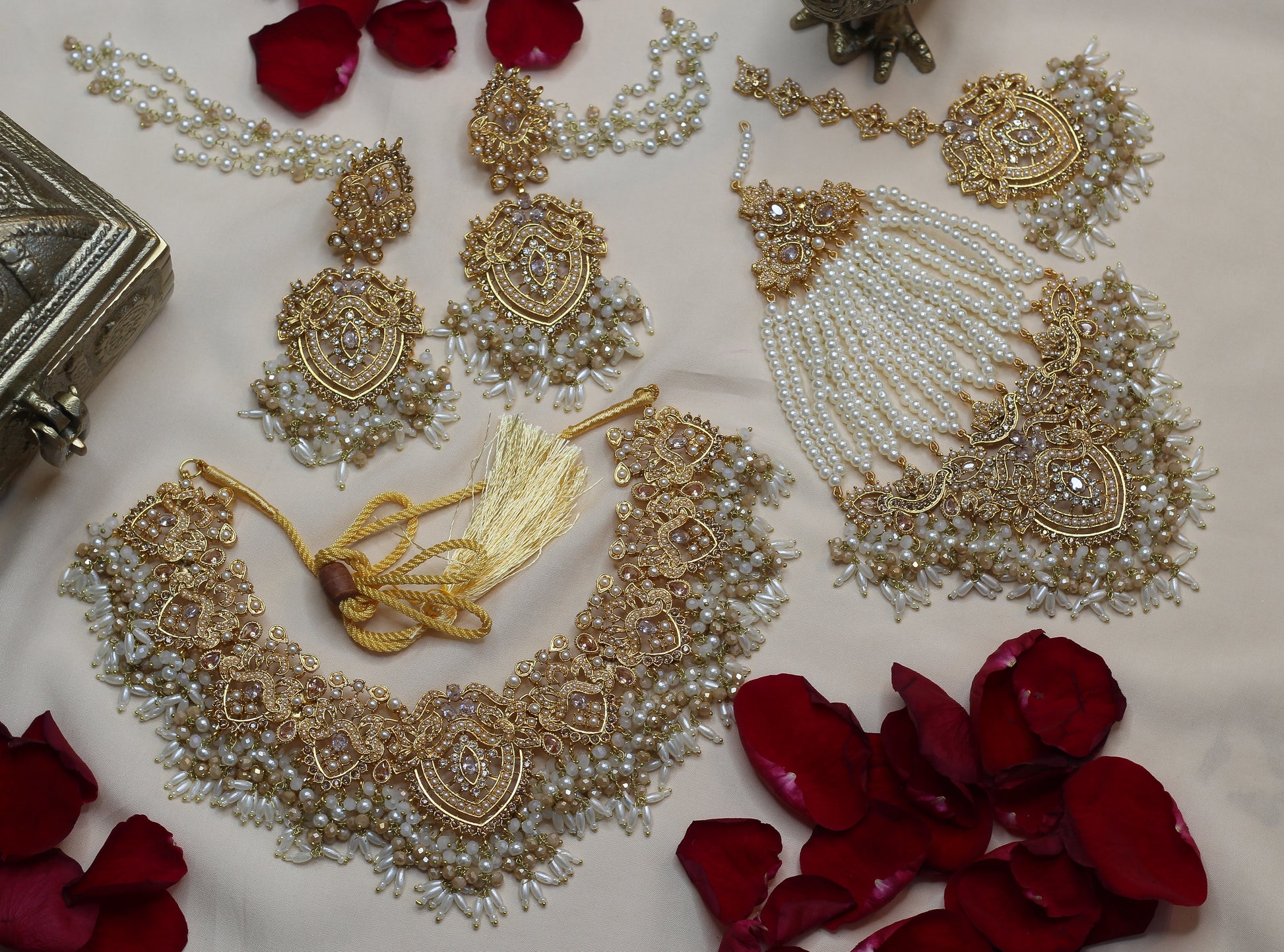 Introducing SADIA : The perfect bridal set that combines trendiness with timeless elegance. With its affordable price, you can have the classic look you've always dreamed of without breaking the bank. Trust in SADIA to make you look stunning on your special day.