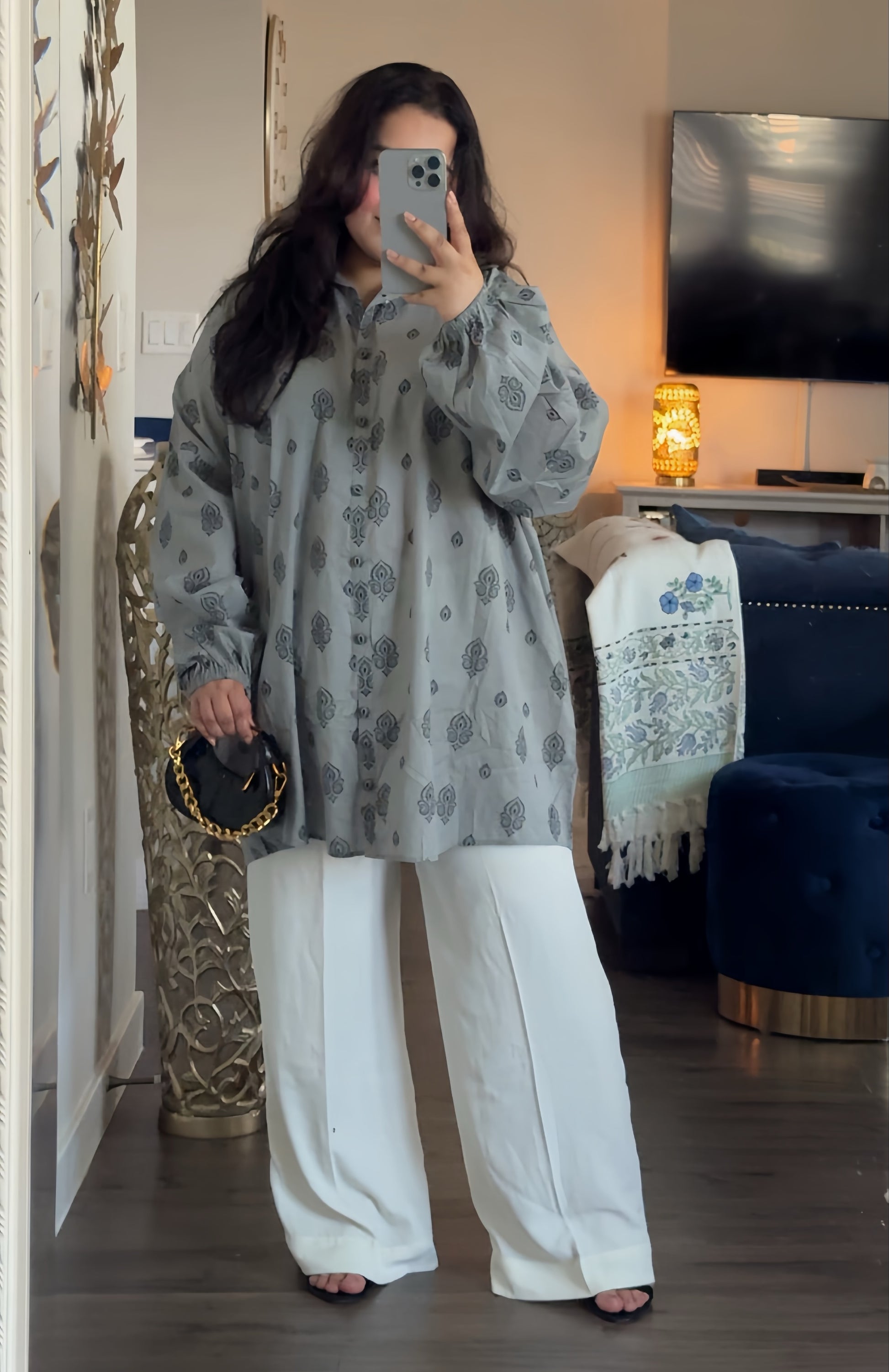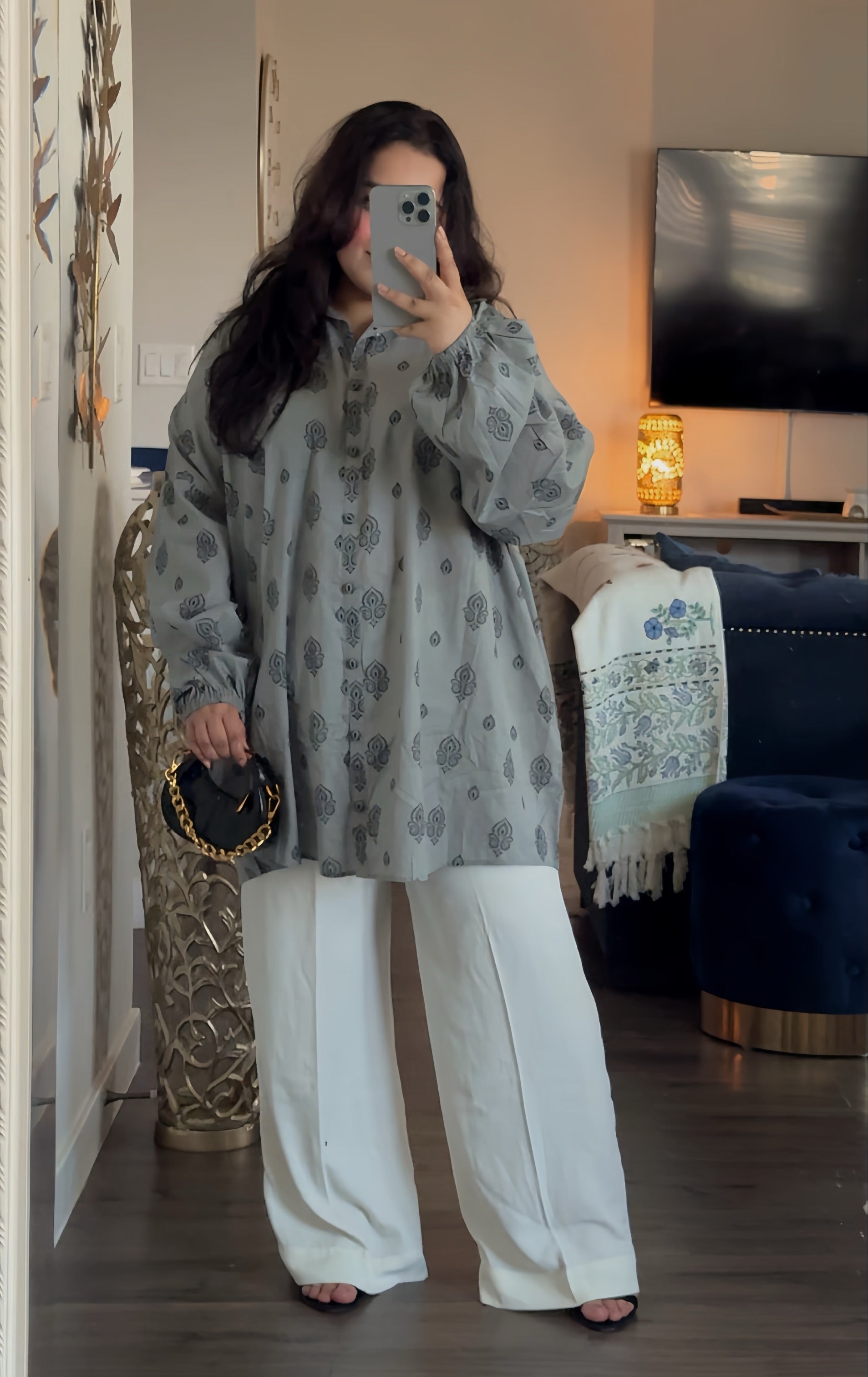 Minimalism meets modern elegance in our  Co-Ord Set. This versatile two-piece ensemble features a soft grey kurti adorned with delicate charcoal-toned motifs, giving it a subtle yet refined edge. The relaxed/oversized silhouette is enhanced by flowy balloon sleeves with gathered cuffs and a modest collar with front buttons for a polished finish. Paired with breezy white wide-leg pants, this look is a go-to for understated days when comfort and style go hand in hand.
