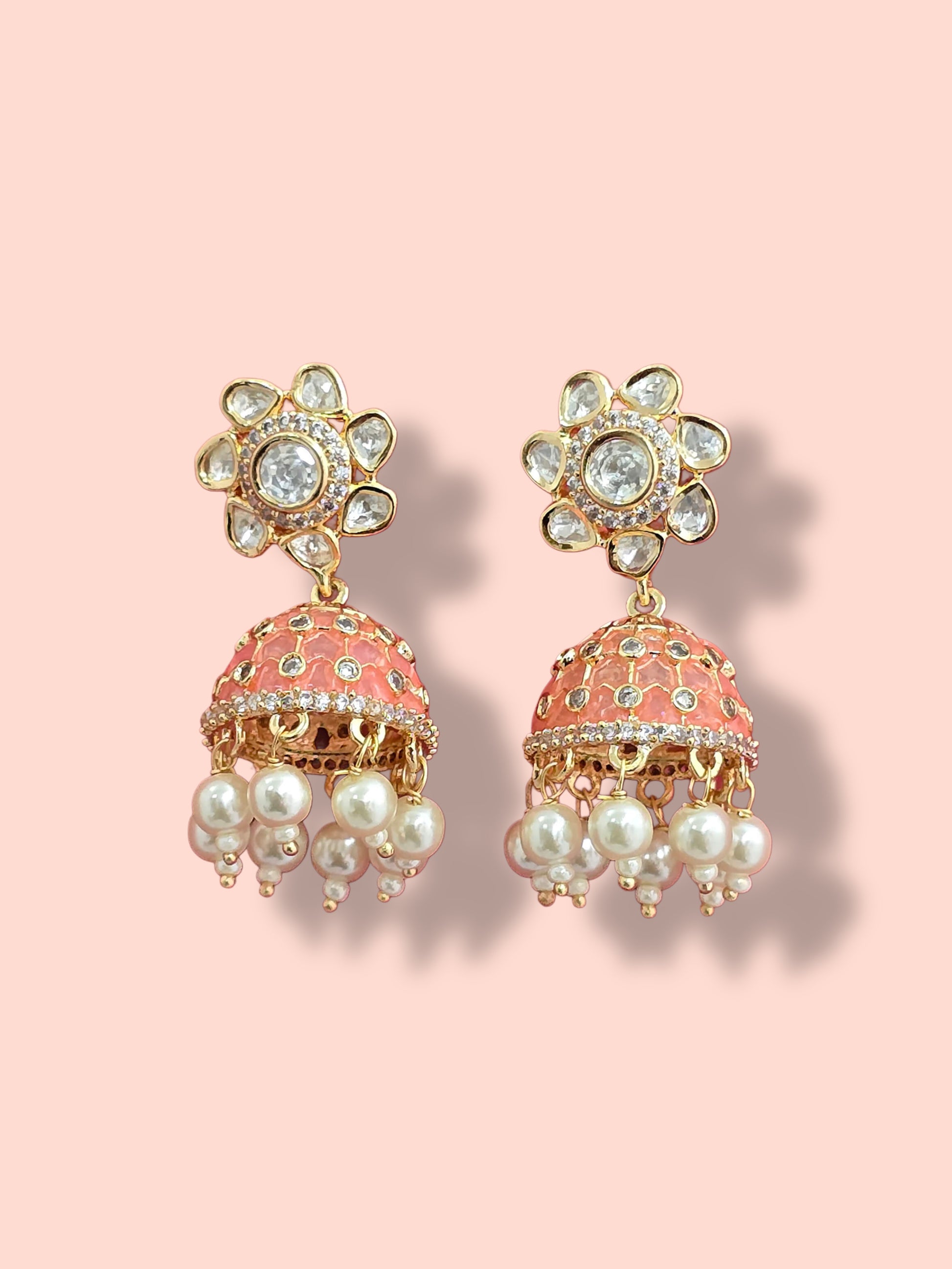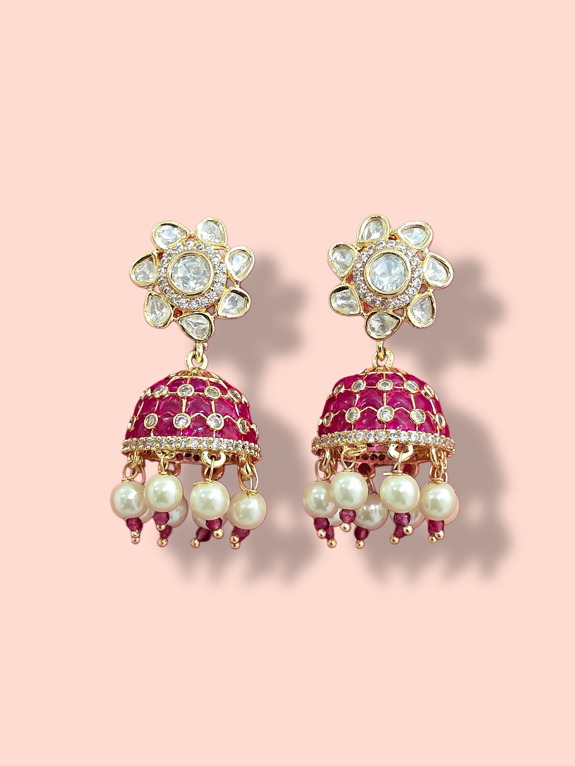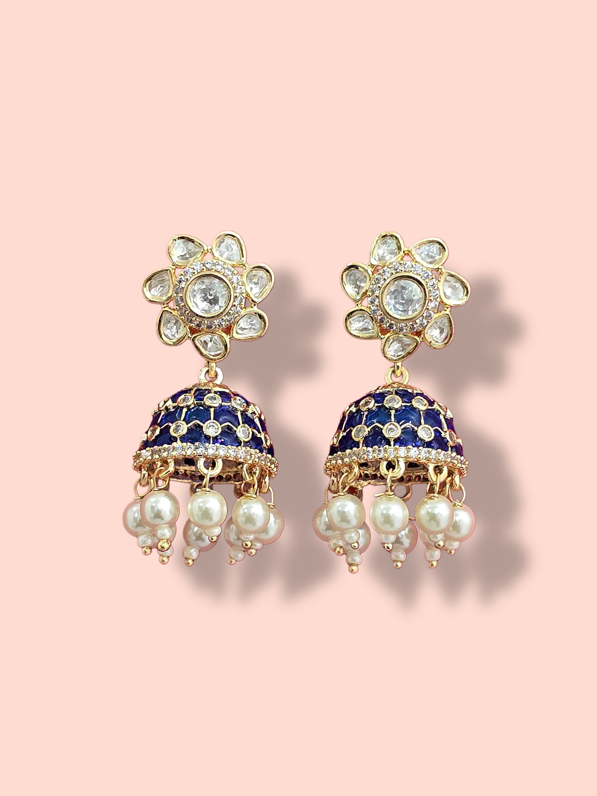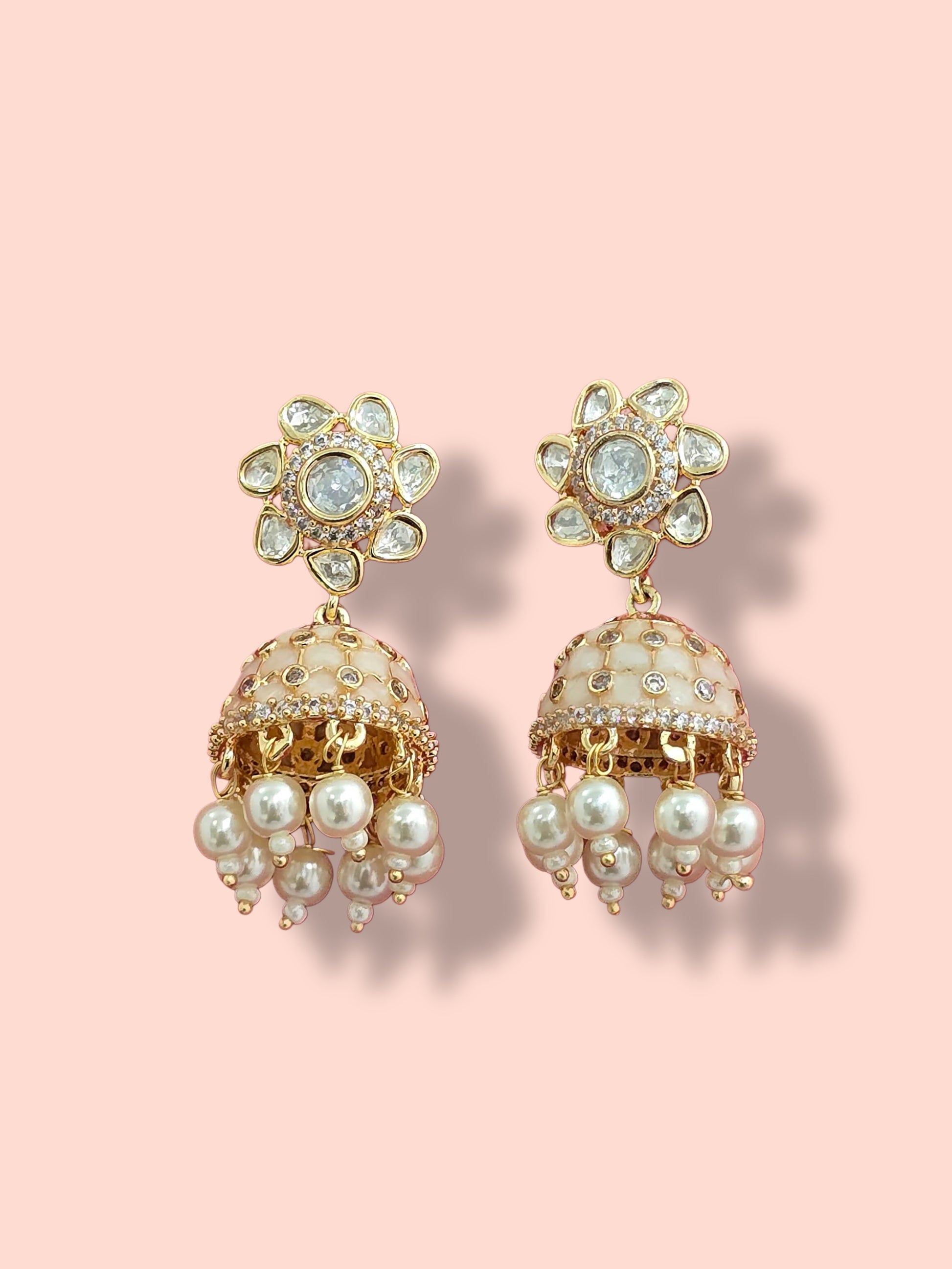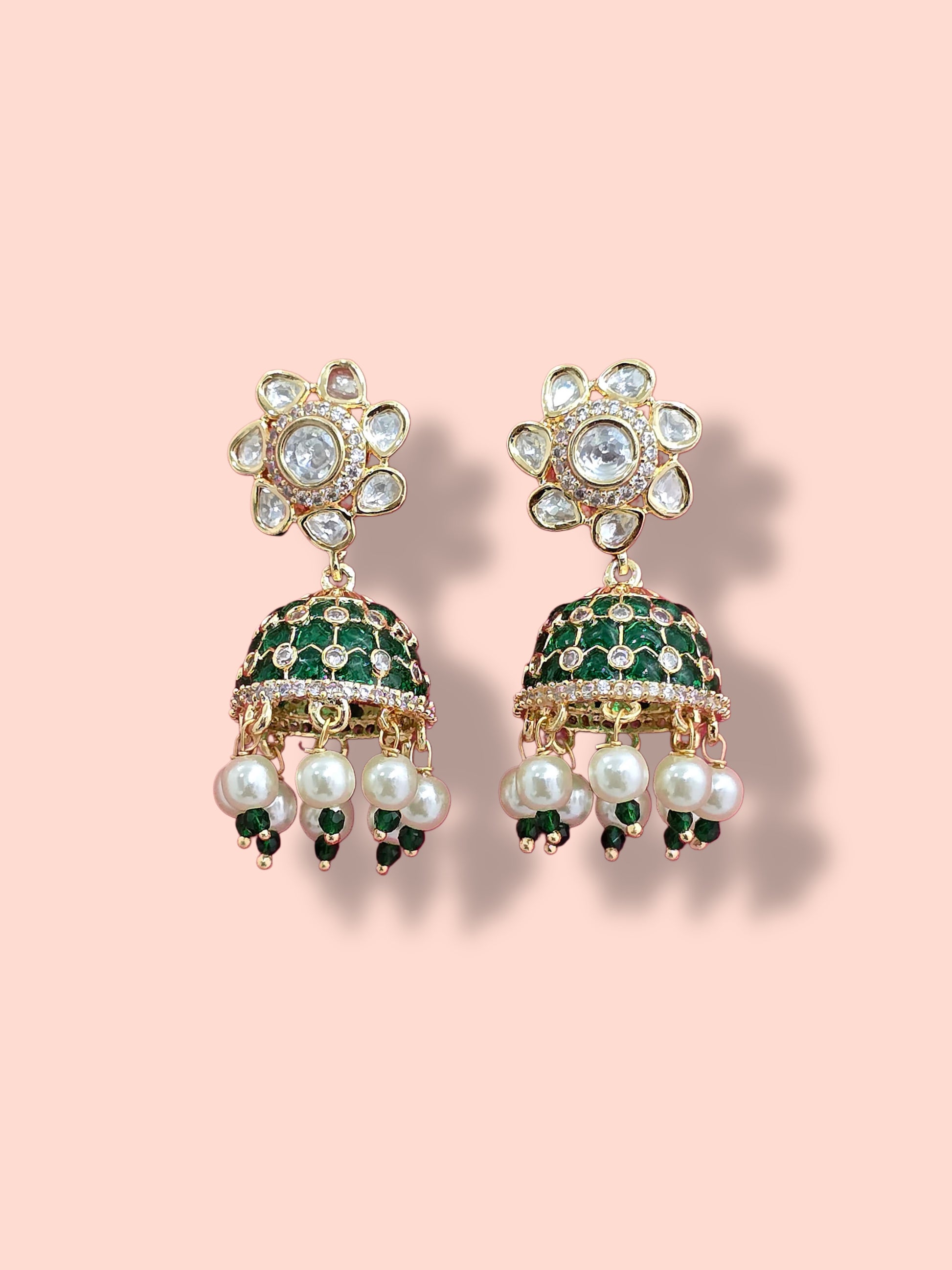 Elevate your festive ensemble with our Zahra Kundan Jhumki Earrings — a perfect blend of tradition and elegance. These stunning earrings feature a floral kundan stud adorned with radiant white stones, leading into an intricately enameled dome jhumki. Finished with lustrous faux pearls and deep green bead hangings, this piece brings a touch of regal charm to any outfit.